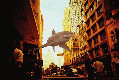 Enquanto em “Clara Crocodilo” tinha-se um anti-herói pelos esgotos e subterrâneos de São Paulo, em “Tubarões Voadores” ganhamos enormes tubarões voando sobre as ruas, devorando adultos e crianças. Ali Luiz Gê através dos tubarões, sintetizou todo o medo e paranóia da classe média, que se tranca dentro de seus apartamentos e carros vedados com insulfilm se isolando dos demais habitantes, por não se sentirem seguros. Onde um passo em falso, uma janela aberta na hora errada, pode resultar em uma absurda tragédia. A hq começa em tom de humor, humor negro, diga-se de passagem, evoluindo para o puro terror, onde a violência é mostrada sem glamour ou justificativa, entre cada ataque dos tubarões são mostradas cenas de violência urbana cotidianas de qualquer cidade: acidentes, mutilações, crimes, atropelamentos e suicídios. Tudo isso se encerra com a cena final de um corpo sendo dilacerado por vários tubarões sob a legenda: “Pois no coração do prudente, repousa a sabedoria”.